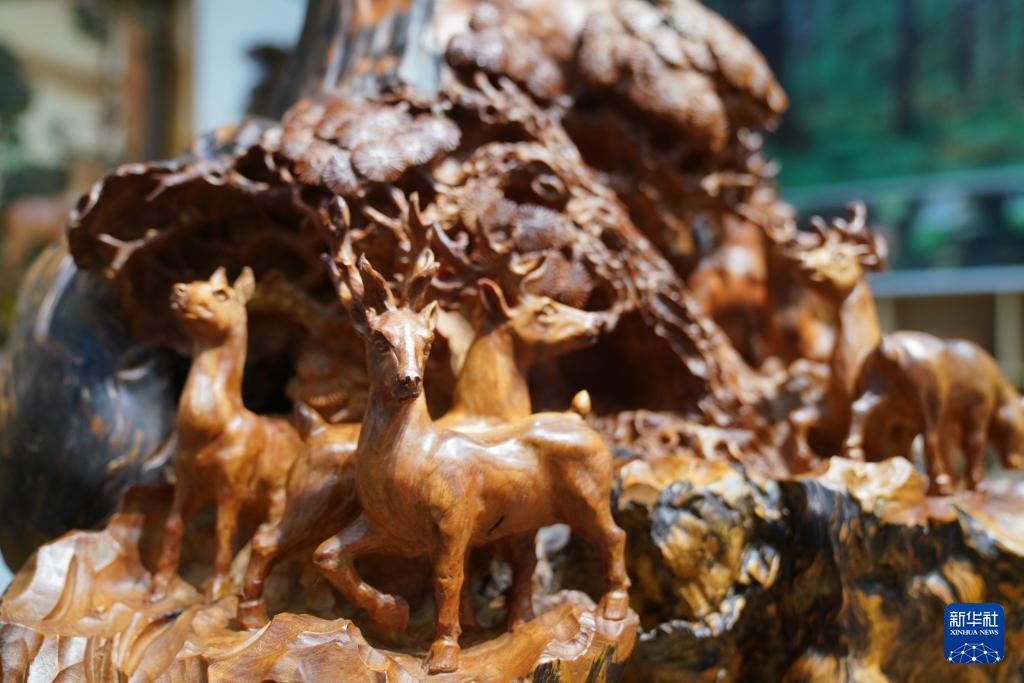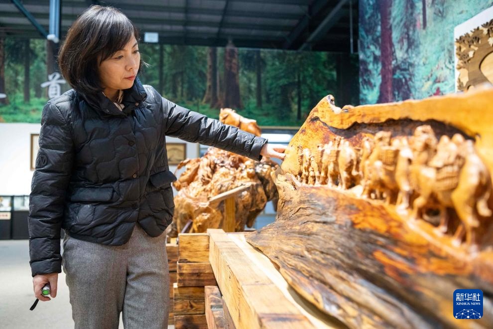 这是3月10日在伊春市永达工艺品有限公司展厅内拍摄的木雕产品。新华社记者 王松 摄