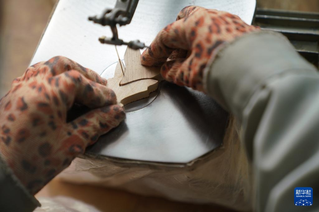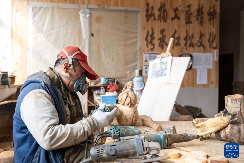 3月10日,在伊春市美江木艺有限责任公司,手艺人在生产车间内制作木艺工艺品。新华社记者 谢剑飞 摄