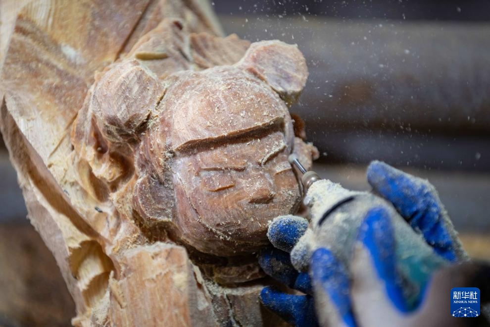 3月10日,在伊春永达工艺品有限公司,手艺人在雕刻哪吒主题的北沉香工艺品。新华社记者 谢剑飞 摄
